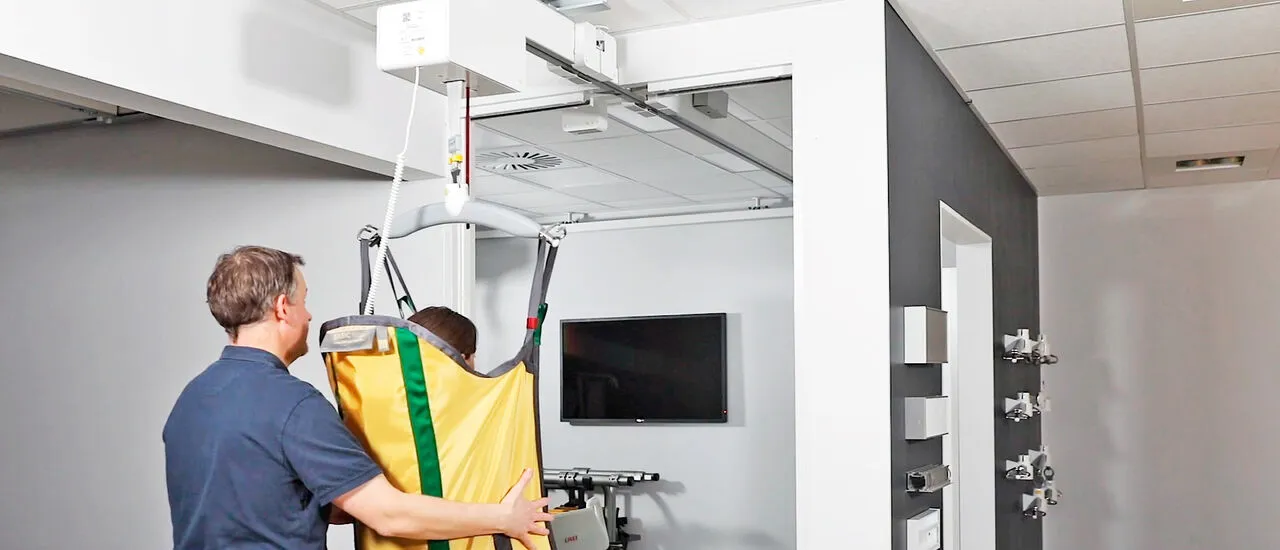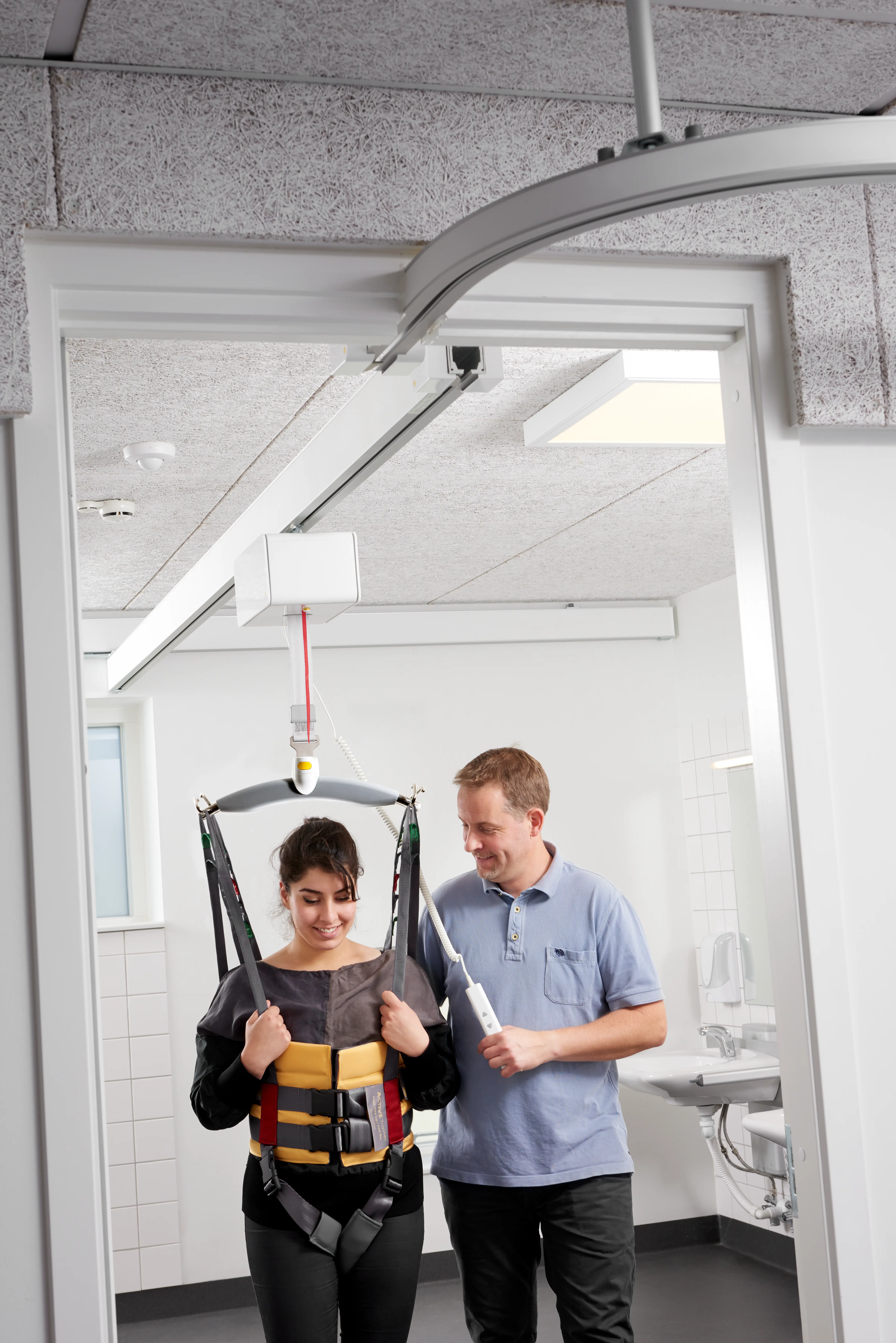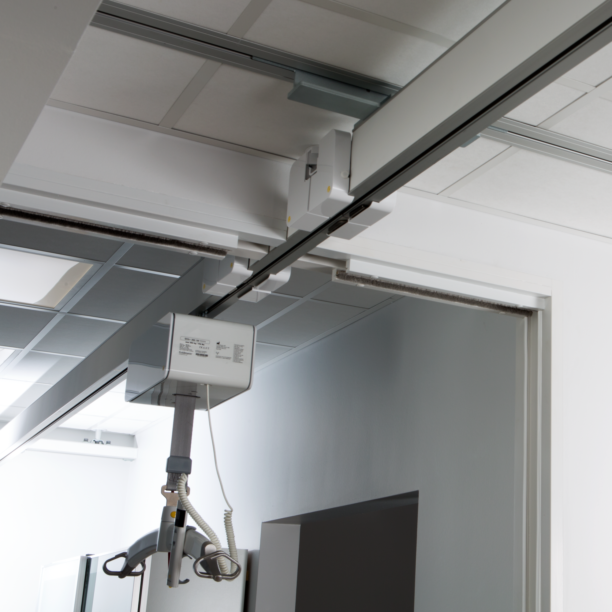 Guldmann Combi-lock is used to link two rail systems. Using the Combi-lock, you can link two rail systems – between bedroom and bathroom, for example – to ensure an easy, comfortable move for the patient. The system consists of two safety locks which make sure that the lifting module cannot disconnect from the rail.